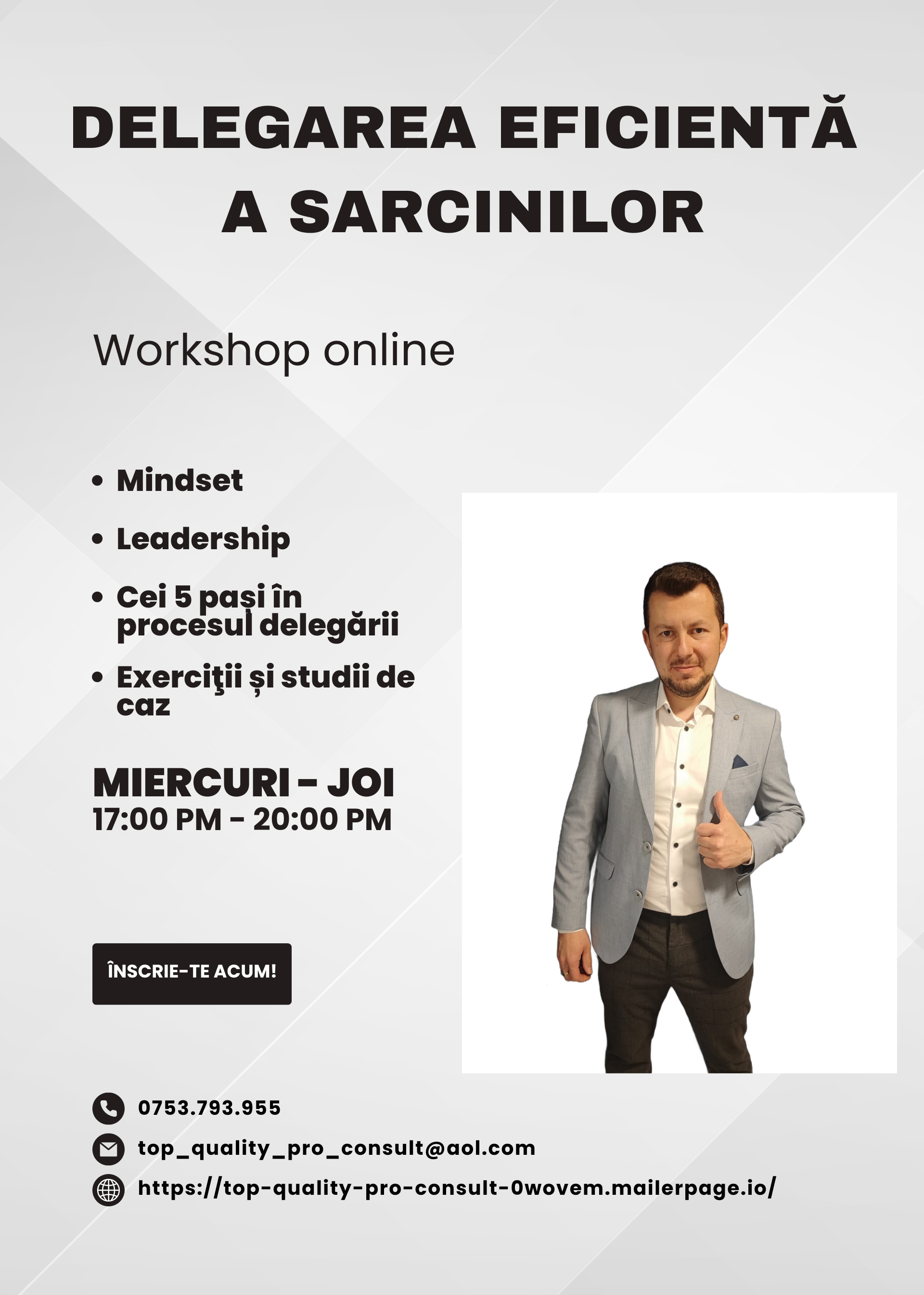 În acest workshop mi-am propus să-ţi dau nu doar niște pași prin care să delegi sarcini și responsabilităţi în mod eficient, ci și un minimum de cunoștinţe și abilităţi prin care să poţi stabili un mediu propice dezvoltării în compania ta.