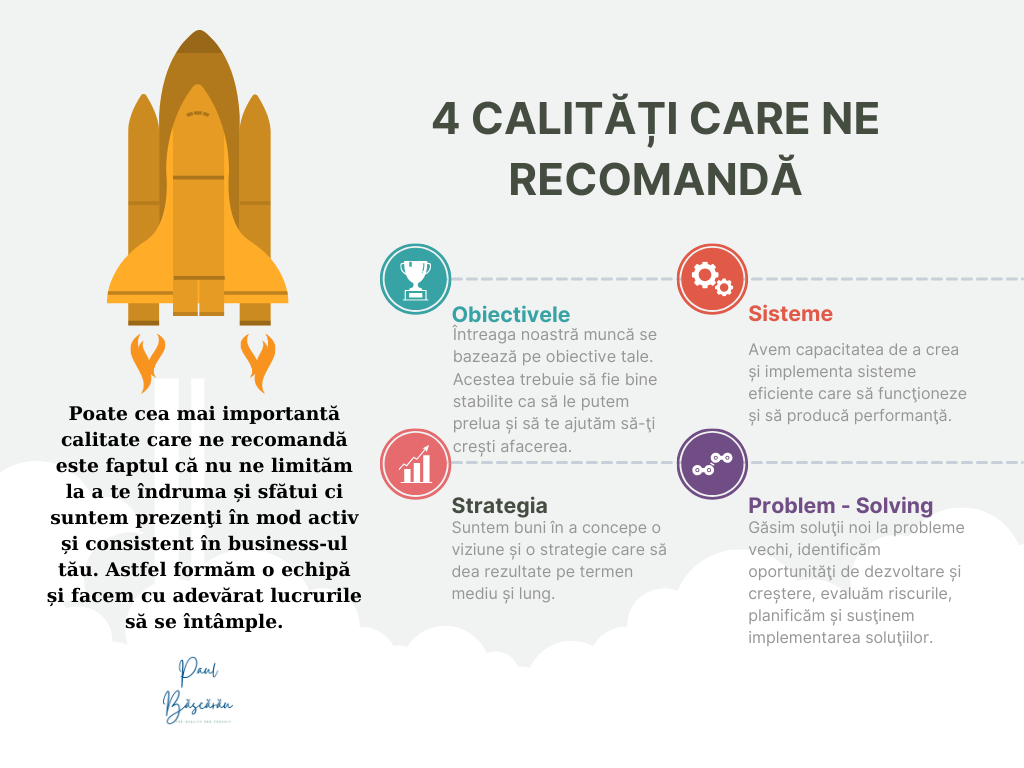 Pe scurt, nu ne place să oferim “soluţii magice” și apoi să te lăsăm să te descurci. În schimb ne face plăcere să fim prezenţi alături de tine și echipa ta, fizic sau online și pas cu pas să parcurgem împreună drumul spre succes.